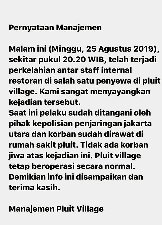 "Malam ini (Minggu, 25 Agustus 2019), sekitar pukul 20.20 WIB, telah terjadi perkelahian antar staff internal restoran di salah satu penyewa di Pluit Village. Kami sangat menyayangkan kejadian tersebut," tulis pihak manajemen mall.