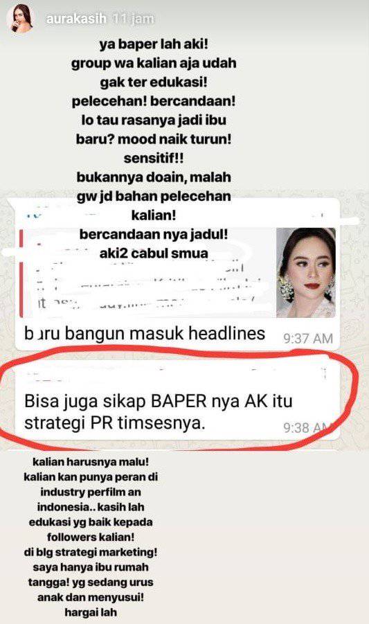"Ya baperlah aki! Group WA kalian saja sudah tidak ter-edukasi! Pelecehan! Bercandaan! Lo tau rasanya jadi ibu baru? Mood naik turun, sensitif! Bukannya doain gue malah jadi bahan pelecehan kalian! Bercandaannya jadul! Aki-aki cabul semua," tulis Aura Kasih.